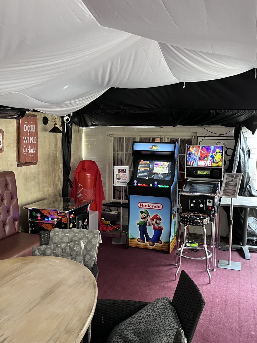 - Compact footprint compared to full-size arcade cabinets. Fits most event spaces.