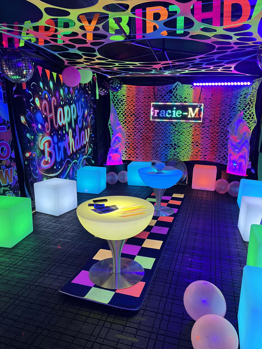 - 2 LED tables — glowing surfaces for gifts/ treats / drinks